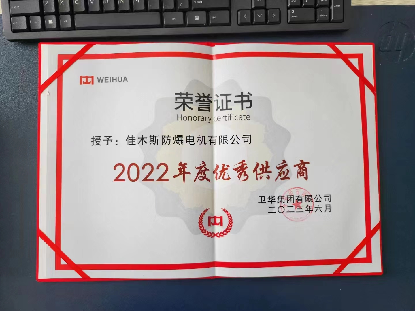 佳木斯防爆電機榮獲衛(wèi)華集團2022年度**供應(yīng)商
